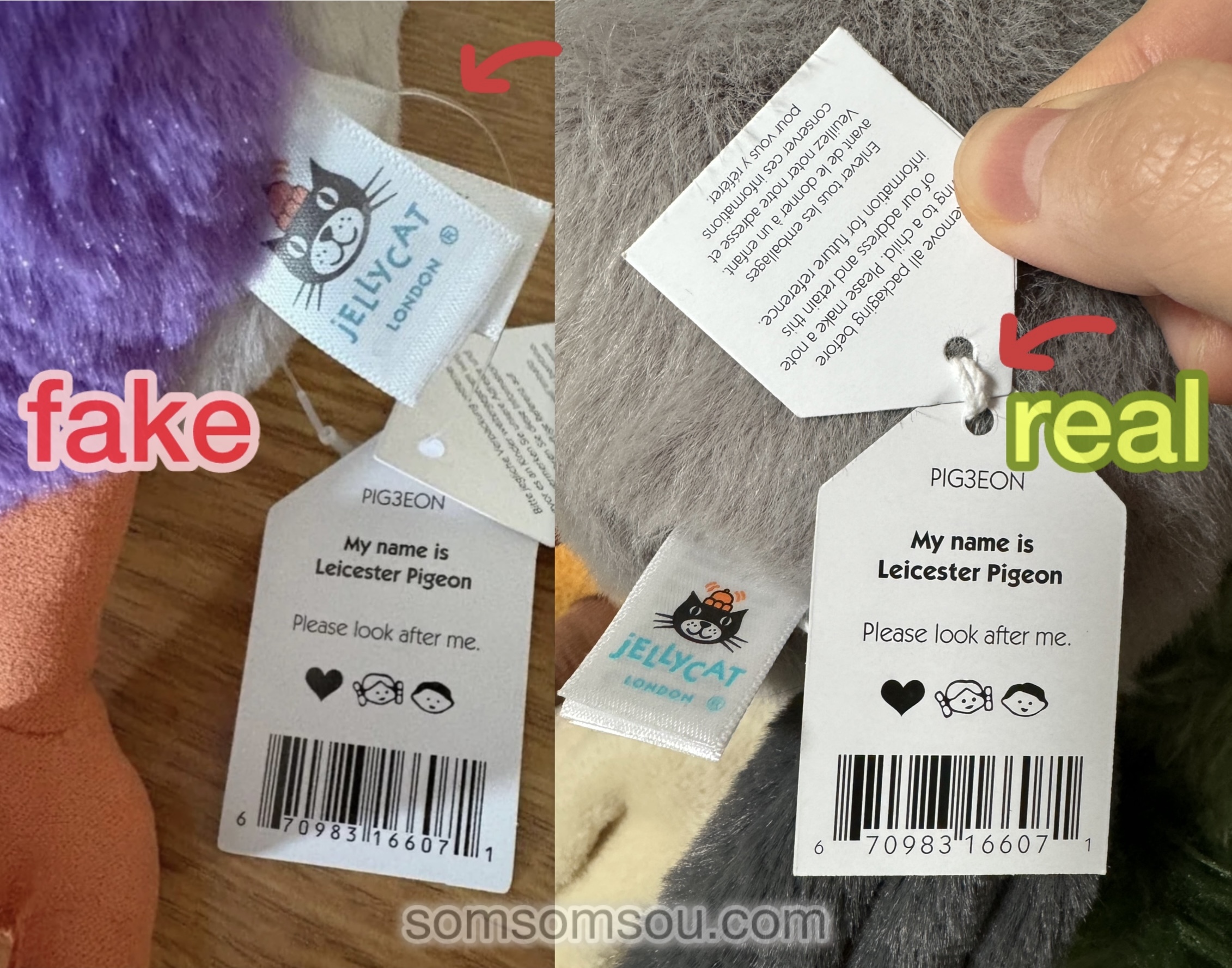 Look for printing quality and consistency. If the tag looks poorly printed, has odd fonts, spelling mistakes, or the product name does not match the plush, be cautious.